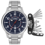 Nesse lançamento a coleção Militar traz relógios em banho prateado com mostrador azul, contador de minutos, calendário em 6h e detalhe de cor no mostrador.
