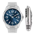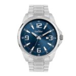 A caixa e a pulseira em aço inoxidável na cor prata reforçam a robustez do modelo, ideal para homens que buscam um relógio marcante para o dia a dia. O modelo conta com calendário diário, resistência à água de até 50 metros e acompanha um chaveiro metálico Condor, adicionando um toque funcional e exclusivo ao kit.