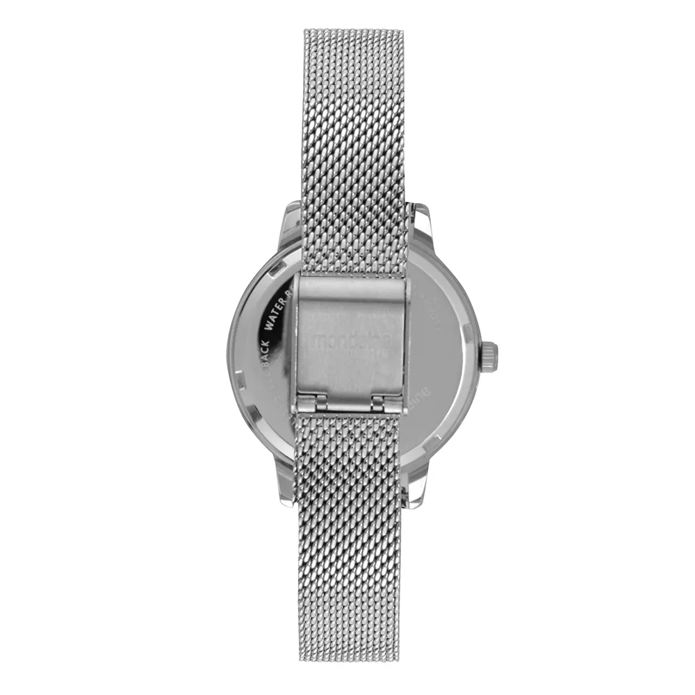 Possui caixa em metal com 3,2 cm de diâmetro e pulseira em malha de aço de fácil ajuste.