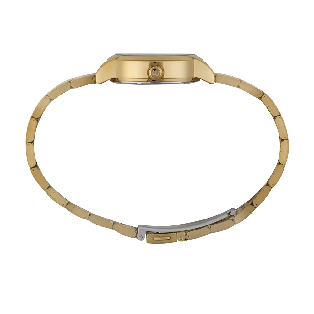 A pulseira em aço dourado com 7 elos destaca o acabamento clássico do modelo.