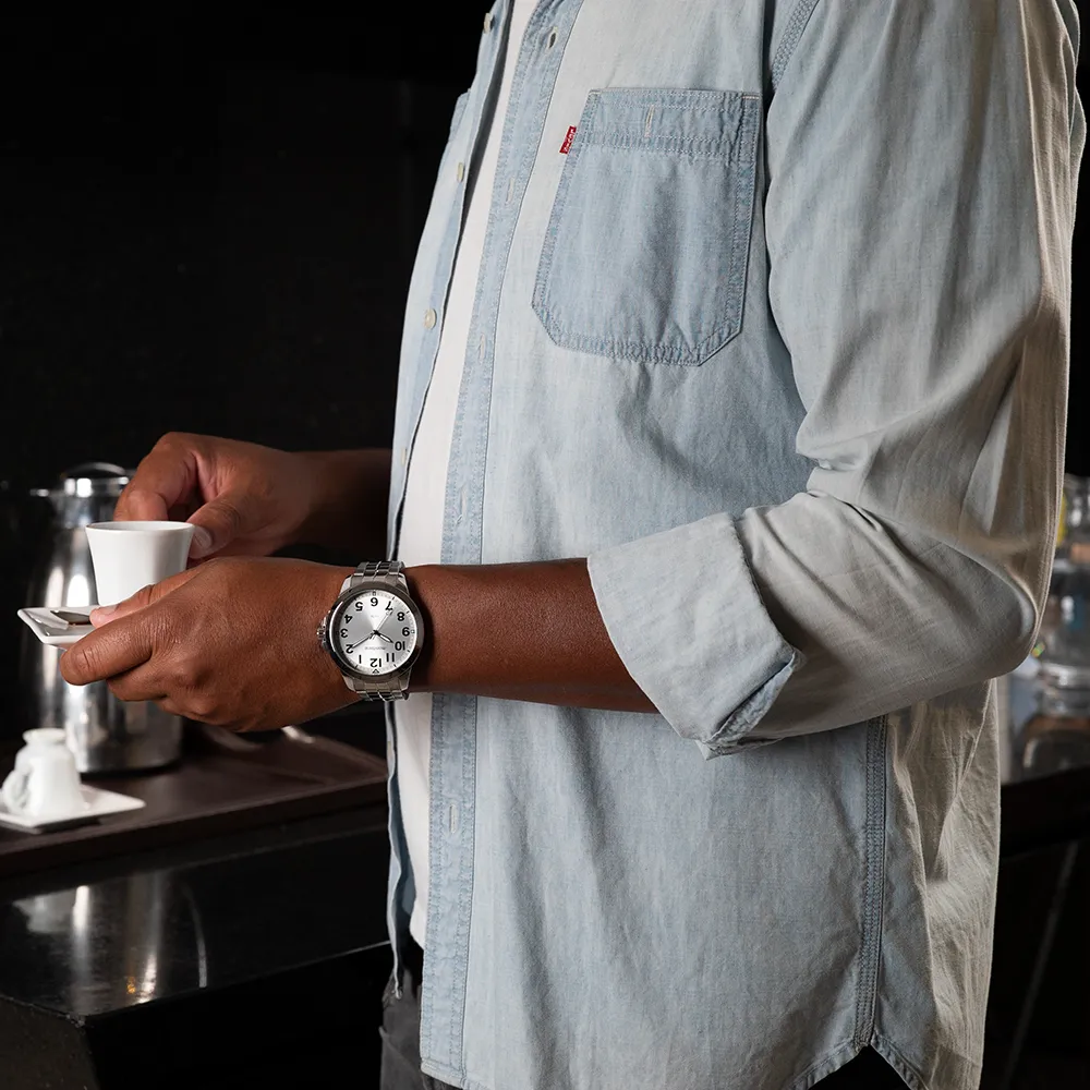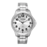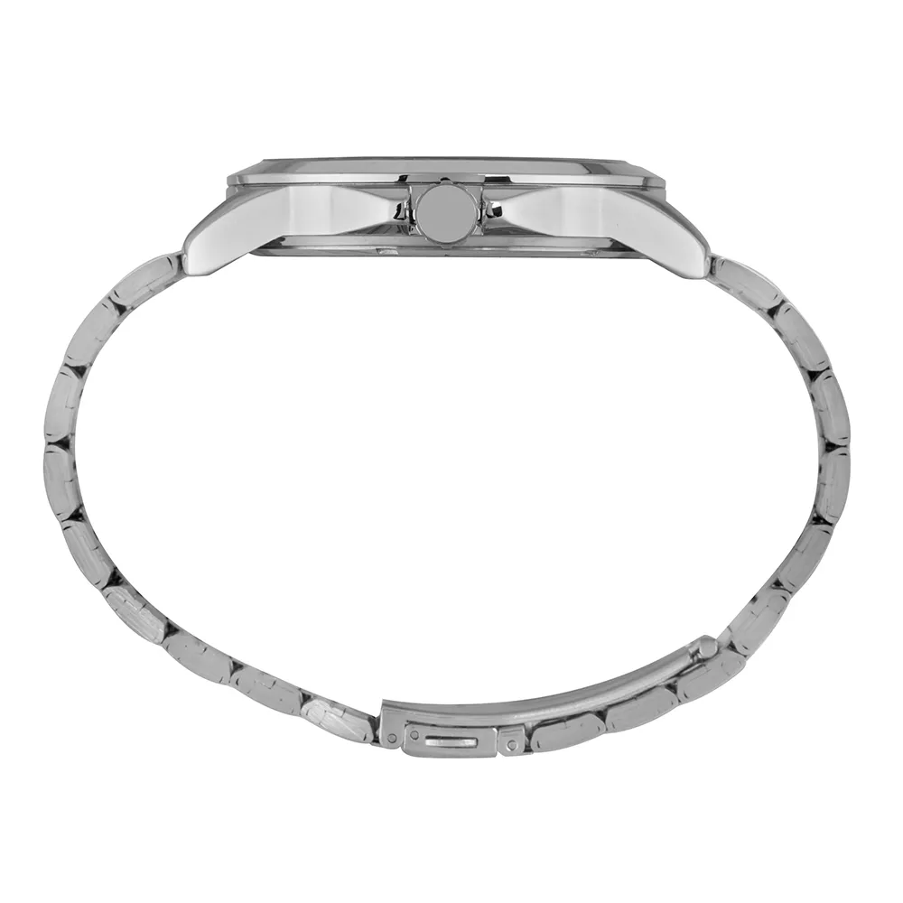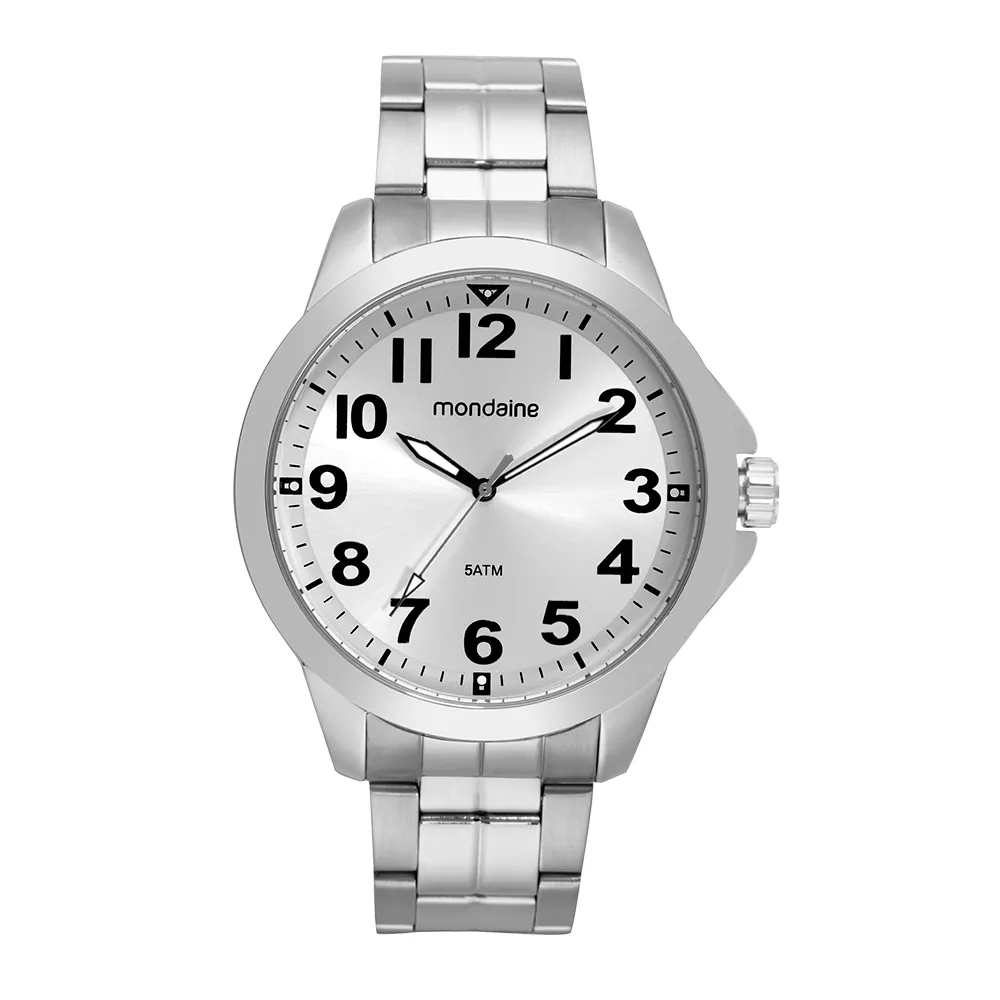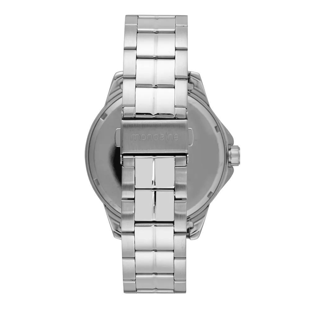 O relógio apresenta numeração completa para facilitar a leitura e uma pulseira em aço com fecho de acionamento lateral, garantindo segurança e conforto.