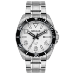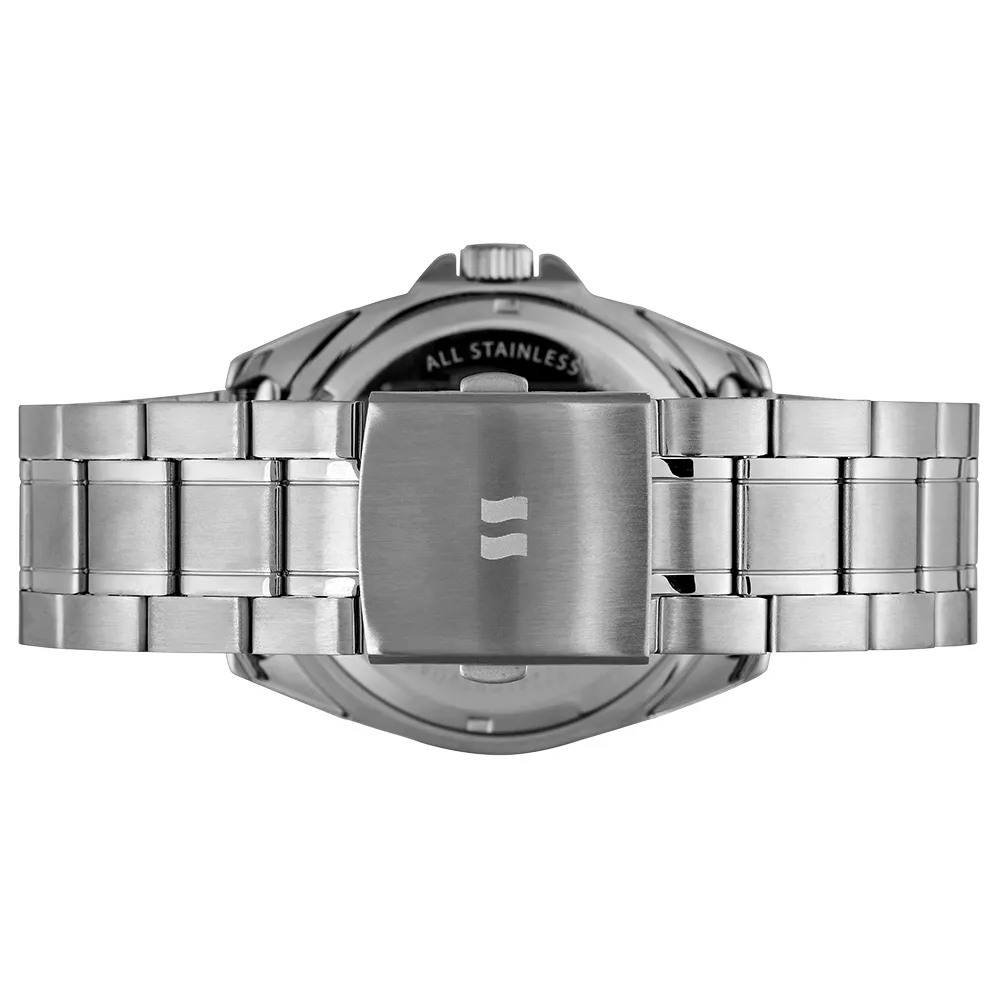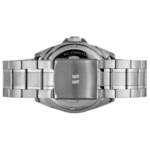 Todo em aço, o relógio apresenta uma catraca com aplicação em alumínio, combinando estilo e durabilidade para um acessório indispensável.