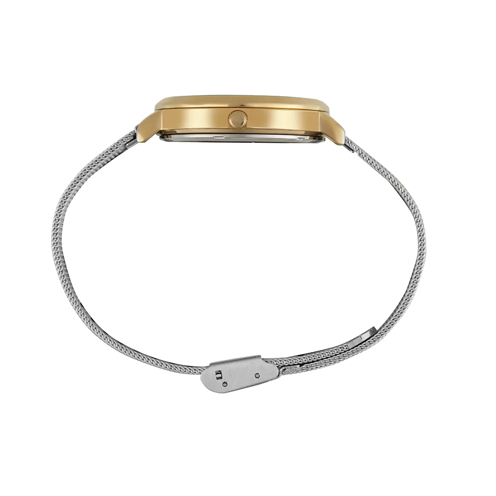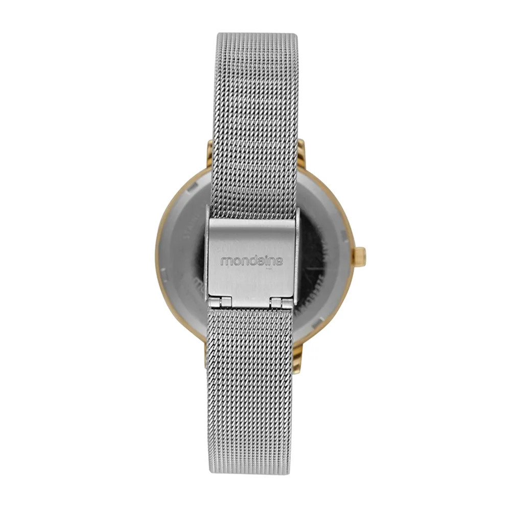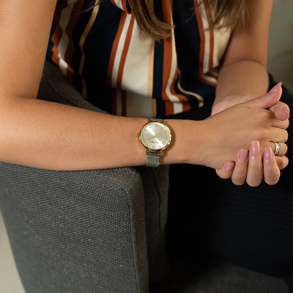 Sua pulseira de malha de aço maleável garante conforto e ajuste fácil, adaptando-se perfeitamente a todos os tamanhos de pulso.