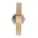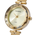 Relógio clássico dourado, com caixa mediana em metal de 3,2 cm de diâmetro e numeração completa, complementado por vidro facetado.