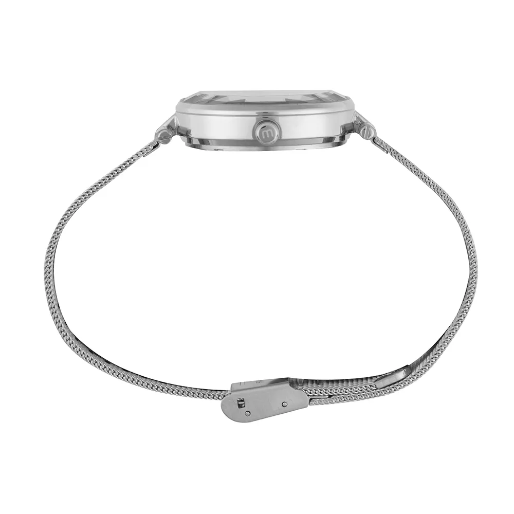 Sua pulseira em malha de aço, com fecho de pressão, garante maior segurança e fácil ajuste.