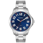 Este relógio analógico casual cromado combina design moderno e funcionalidade, com mostrador azul metálico e numeração completa para leitura clara das horas.