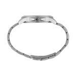 A pulseira, elaborada em aço escovado, apresenta detalhes polidos entre os elos,
