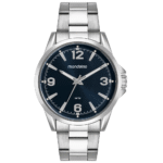 Com design clássico e robusto, este relógio masculino apresenta mostrador azul com numeração e indexes combinados.