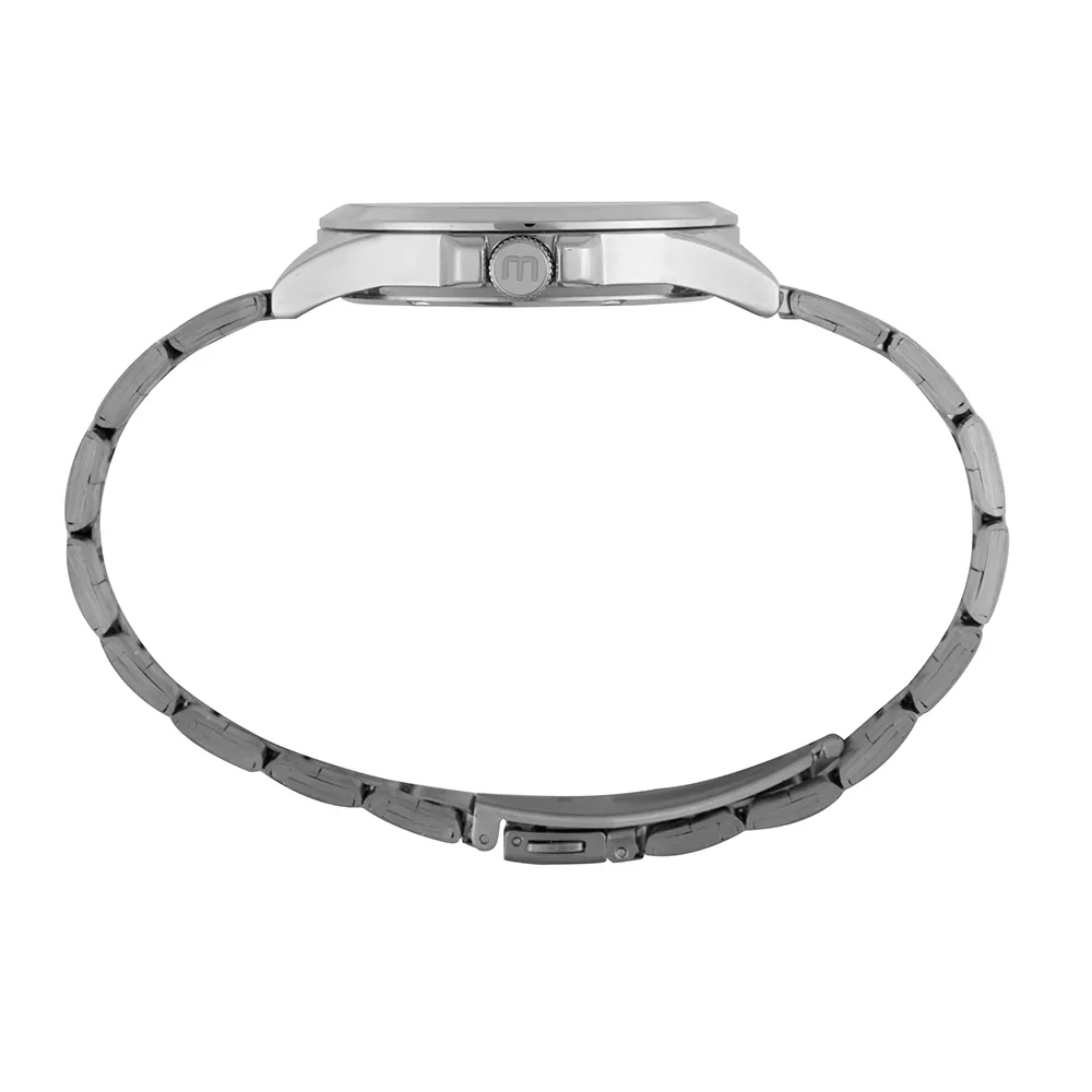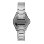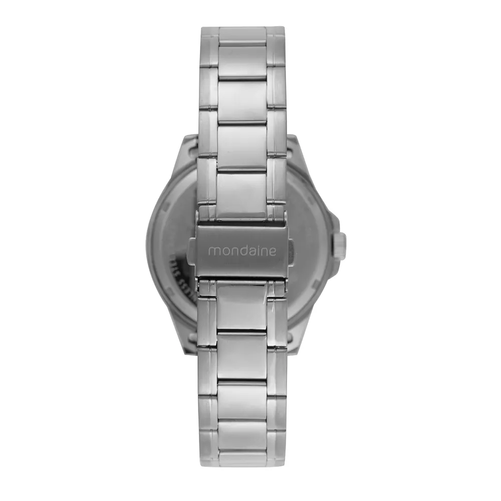 Este relógio analógico casual tem mostrador preto com números grandes para facilitar a leitura das horas. A caixa de metal é mediana com 4,2 cm de diâmetro, enquanto a pulseira é em aço com acabamento escovado e polido.