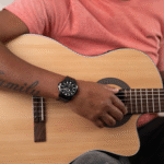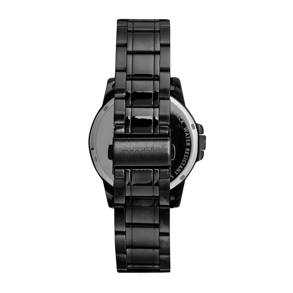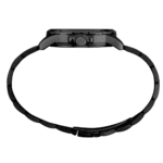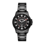 Com um mostrador texturizado e marcadores geométricos de fácil visualização, além de um calendário integrado, ele exibe folheação preta.