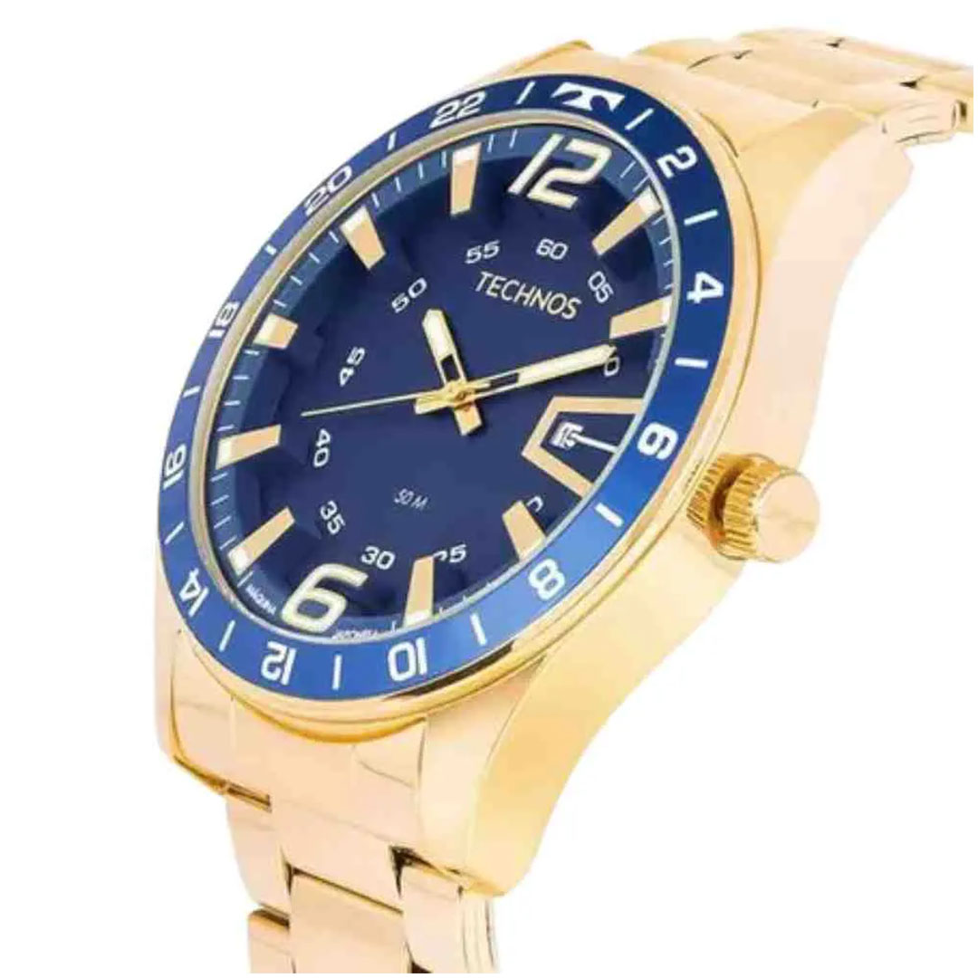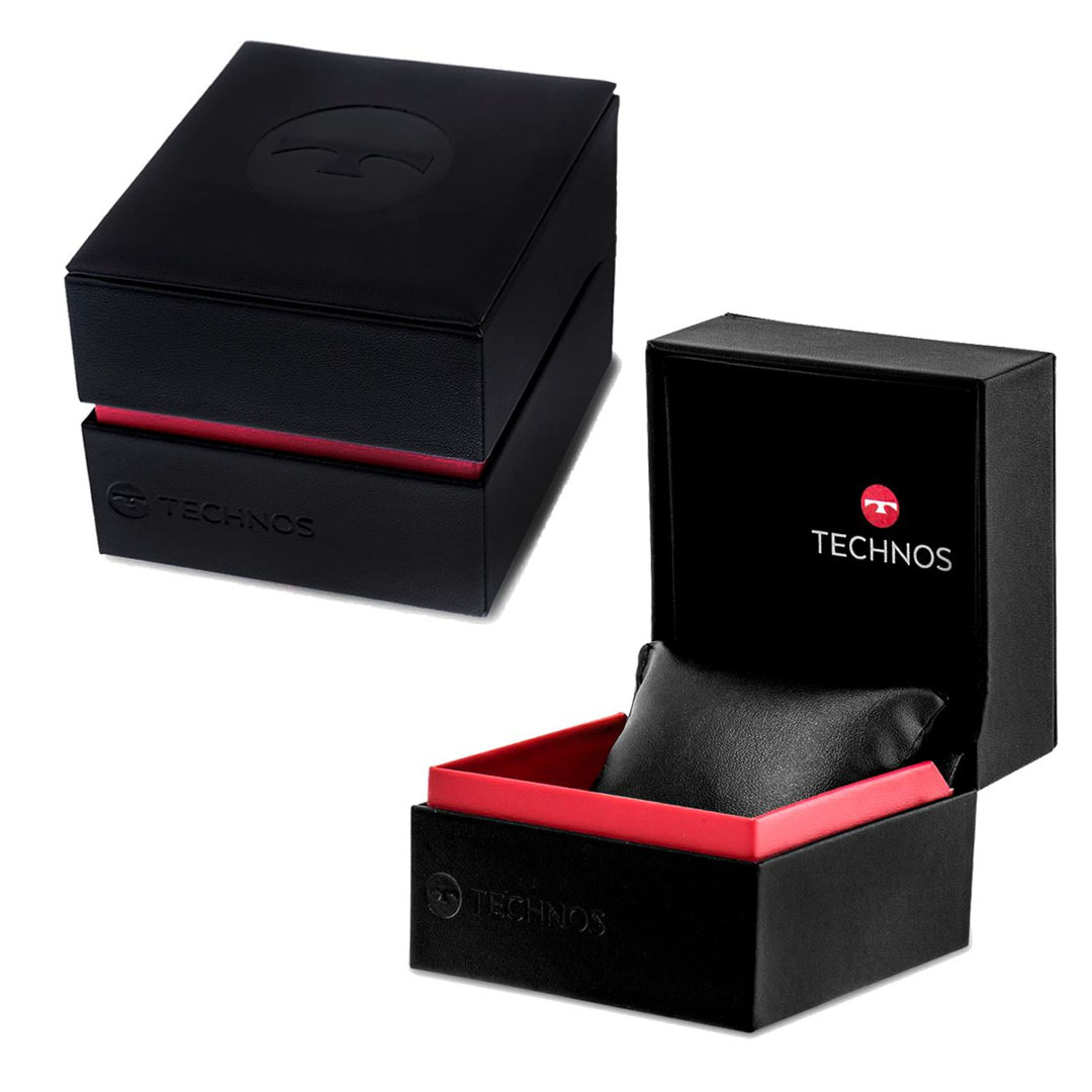 O mostrador preto traz calendário e indexes em camadas tridimensionais. Modelo resistente a água até 50 metros.